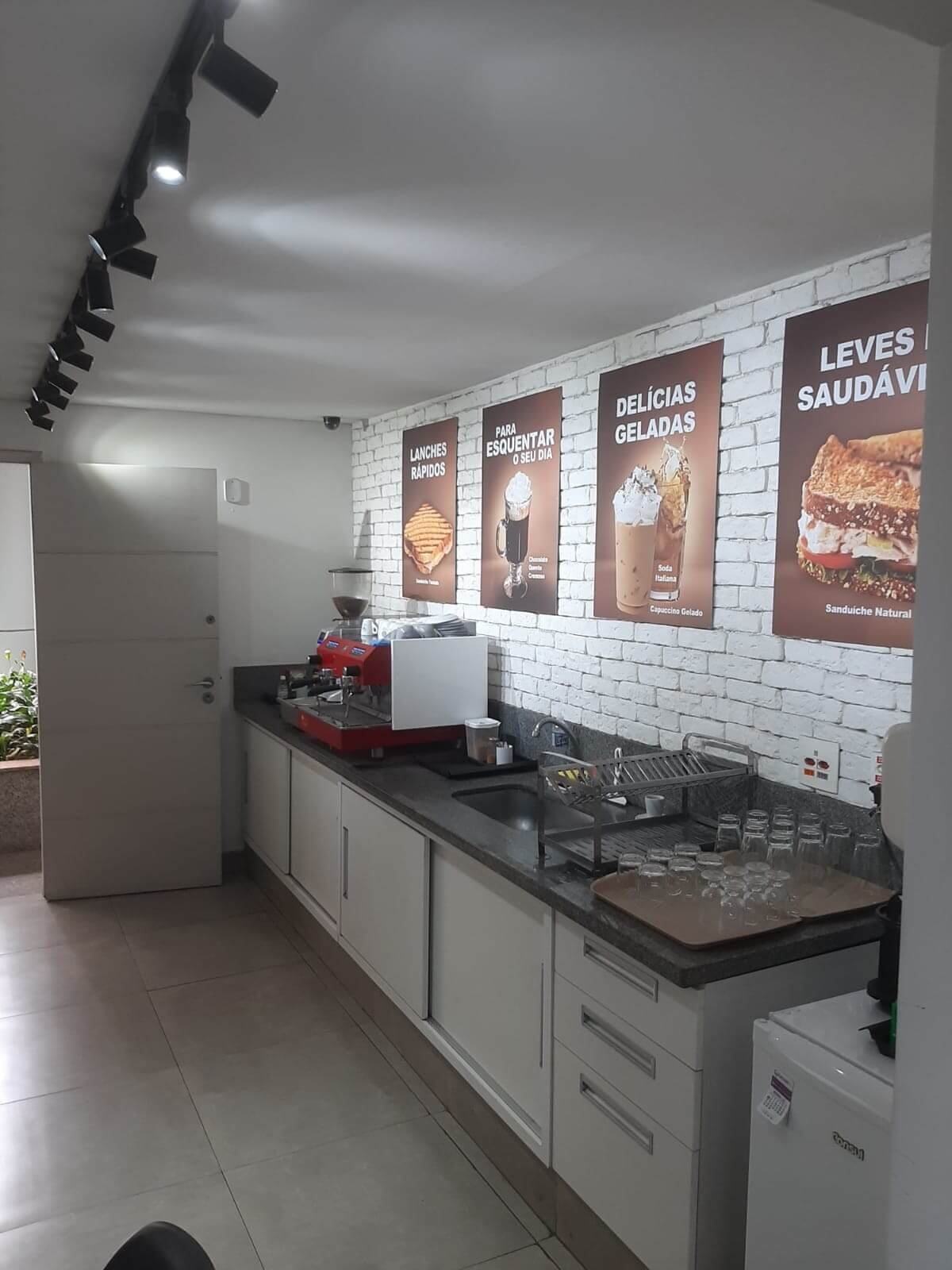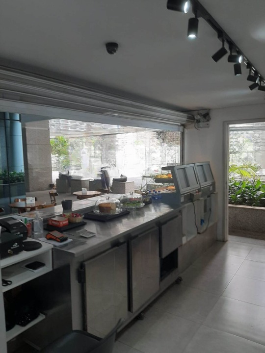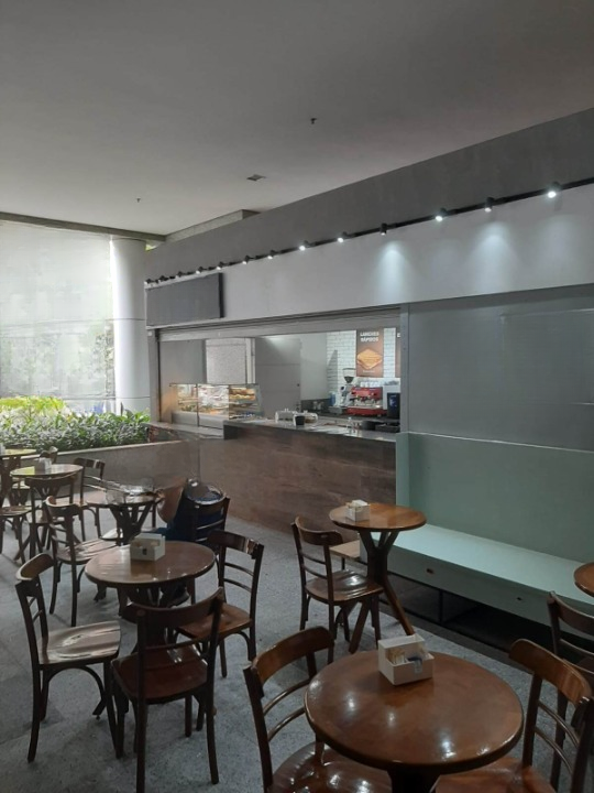 A cafeteria é confinada, entretanto tem entrada e visibilidade para os clientes de fora do prédio comercial.